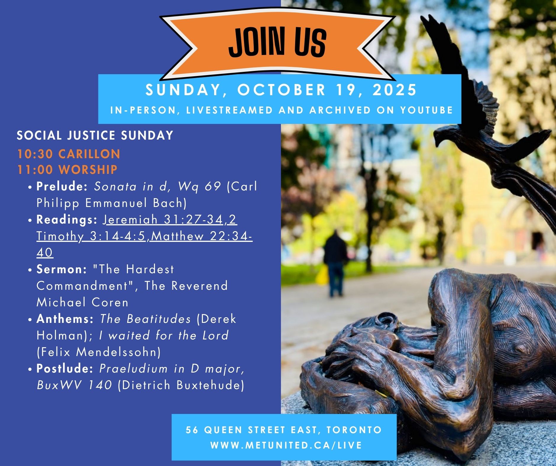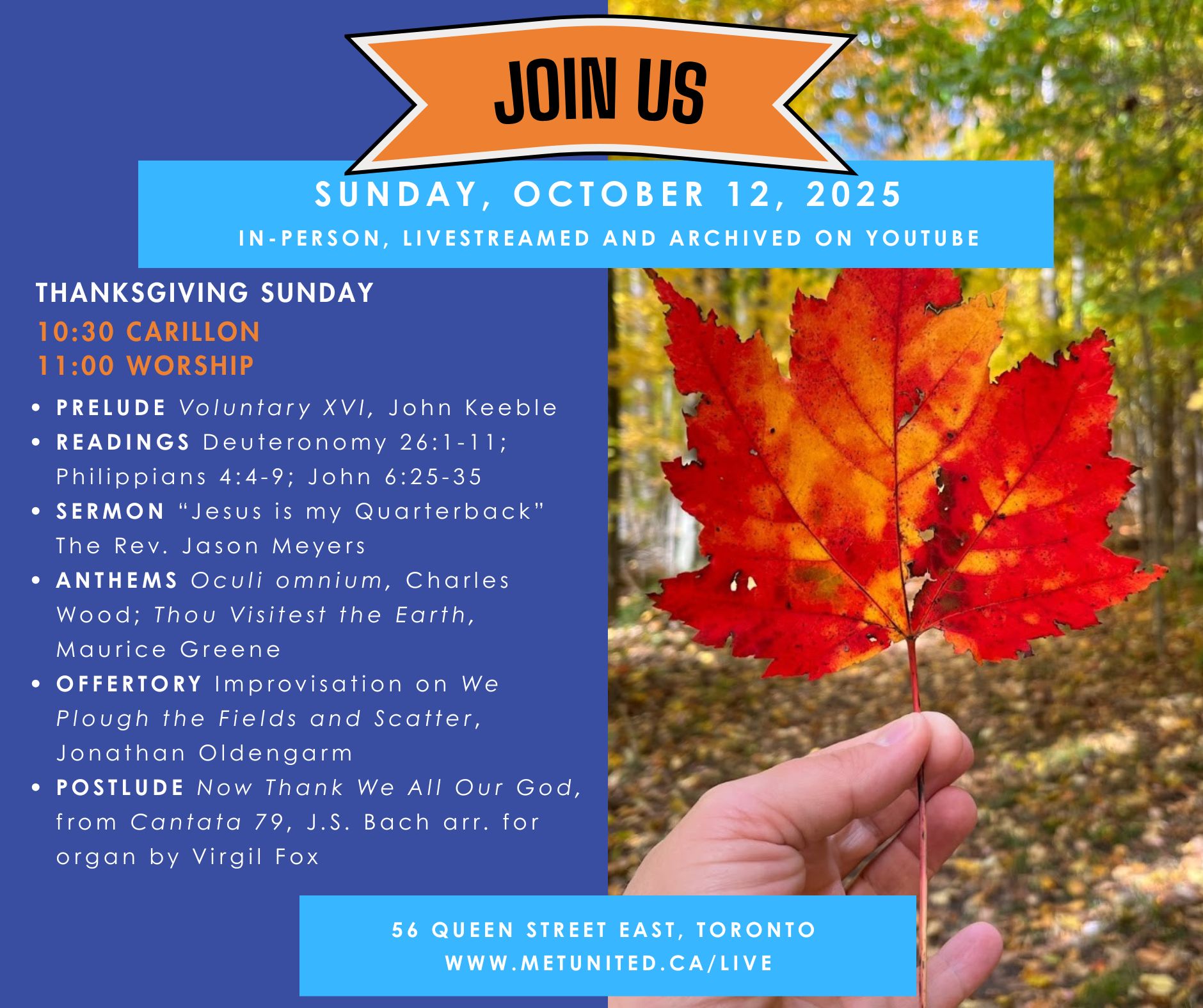 We worship each week at 11 am in-person at Church and Queen in downtown Toronto and online via livestream.